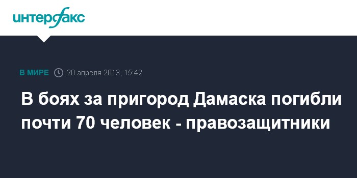 Лондон. 20 апреля. INTERFAX.RU - По меньшей мере 69 человек погибли в ходе четырех дней ожесточенных боев за населенный пункт Дждайдет аль-Фадль в пригороде столицы Сирии, сообщает в субботу базирующийся в Лондоне сирийский Наблюдательный совет по правам человека. "Войска режима пытаются взять под контроль город Дждайдет аль-Фадль. За последние четыре дня там погибли 69 человек", - говорится в сообщении.