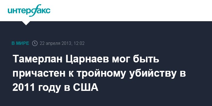 Вашингтон. 22 апреля. INTERFAX.RU - Друзья Тамерлана Царнаева подозревают его в причастности к тройному убийству, совершенному в 2011 году в американском городе Уолтеме, сообщает информационный портал BuzzFeed. "Тогда никто не мог подумать, что это был Там. То событие (убийство - ИФ) вызвало столько эмоций, мы подумали, что это сделал кто-то другой", - сказал общий друг Царнаева, представившийся Рэем.