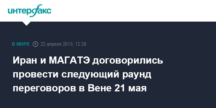 Тегеран. 22 апреля. INTERFAX.RU - Следующий раунд переговоров между Ираном и МАГАТЭ пройдет в Вене 21 мая, сообщает в понедельник иранское агентство "Мехр".