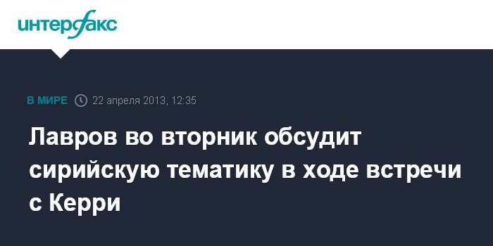 Москва. 22 апреля. ИНТЕРФАКС-АВН - Глава МИД РФ Сергей Лавров сообщил, что 23 апреля он встретится с госсекретарем США Джоном Керри и обсудит сирийскую тематику.