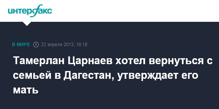 Вашингтон. 22 апреля. INTERFAX.RU - Тамерлан Царнаев, подозреваемый в осуществлении терактов в Бостоне, хотел переехать из США в Дагестан, сообщила его мать Зубейдат Царнаева американским СМИ.