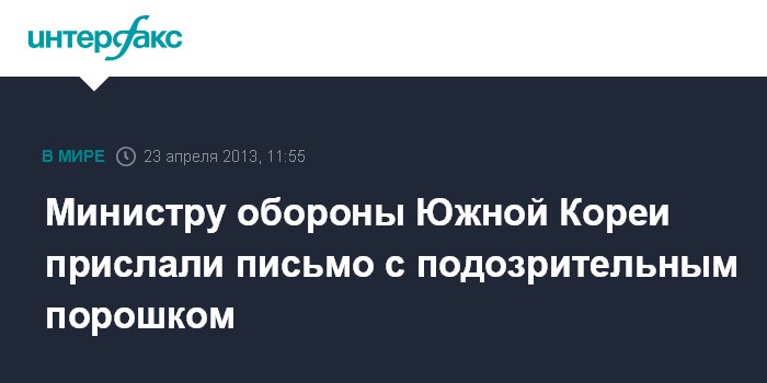 Сеул. 23 апреля. INTERFAX.RU - На имя главы оборонного ведомства Южной Кореи Ким Гван Чжина было отправлено письмо с угрозами, в котором вдобавок содержался белый порошок, сообщили во вторник представители южнокорейских властей.