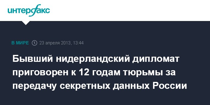 Гаага. 23 апреля. INTERFAX.RU - Нидерландский дипломат, названный прокурорами самым крупным шпионом в современной истории страны, приговорен к 12 годам лишения свободы за передачу секретных данных России, сообщает министерство юстиции королевства.