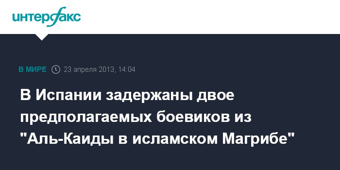 Мадрид. 23 апреля. INTERFAX.RU - Полиция Испании задержала в городах Мурсии и Сарагосе двух предполагаемых членов подразделения "Аль-Каиды" в Северной Африке, передает во вторник испанская телерадиокомпания RTVE.