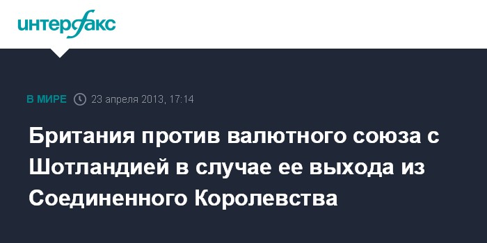 Лондон. 23 апреля. INTERFAX.RU - Британское правительство высказалось против валютного союза с Шотландией в случае ее выхода из состава Соединенного Королевства, приведя в пример проблемы еврозоны, сообщает агентство Bloomberg.