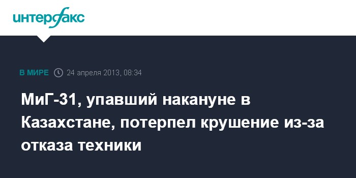 Астана. 24 апреля. INTERFAX.RU - У военного самолета МиГ-31, упавшего в Карагандинской области Казахстана, произошел отказ техники, сообщила пресс-служба Минобороны республики.