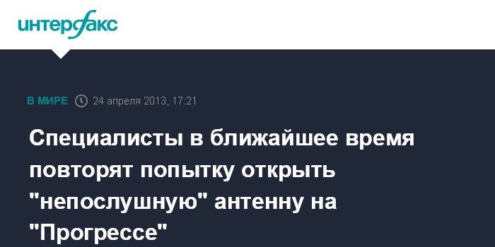 Королев (Московская область). 24 апреля. INTERFAX.RU - Следующая попытка раскрыть антенну на грузовом корабле "Прогресс", предназначенную для его сближения с МКС, будет предпринята с 17:40 мск до 18:00 мск, сообщили "Интерфаксу" в среду в Центре управления полетами.