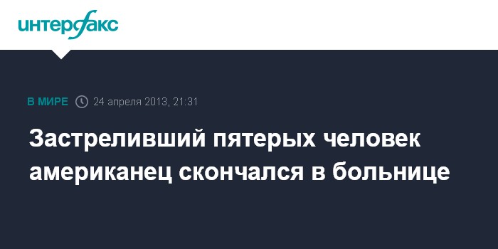 Вашингтон. 24 апреля. INTERFAX.RU - Мужчина, подозреваемый в стрельбе в американском штате Иллинойс, в результате которой погибли пять человек, скончался в местной больнице, сообщила в среду газета Chicago Tribune.