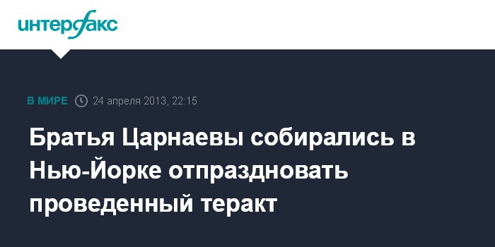 Вашингтон. 24 апреля. INTERFAX.RU - Предполагаемые организаторы теракта на бостонском марафоне - братья Царнаевы собирались поехать в Нью-Йорк, чтобы отметить там совершенную атаку, сообщил в среду американский канал NBC со ссылкой на правоохранительные органы.