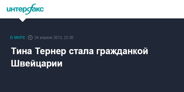 Женева. 24 апреля. INTERFAX.RU - Всемирно известная американская поп-исполнительница Тина Тернер получила гражданство Швейцарии, сообщила в среду цюрихская газета Blick.