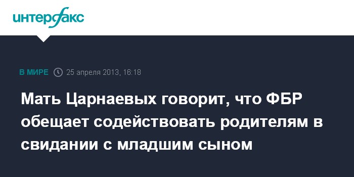 Махачкала. 25 апреля. INTERFAX.RU - Зубейдат Царнаева, мать подозреваемых в бостонском теракте Тамерлана и Джохара, заявила, что на беседе с ней сотрудники ФБР обещали помощь в организации свидания с младшим сыном.