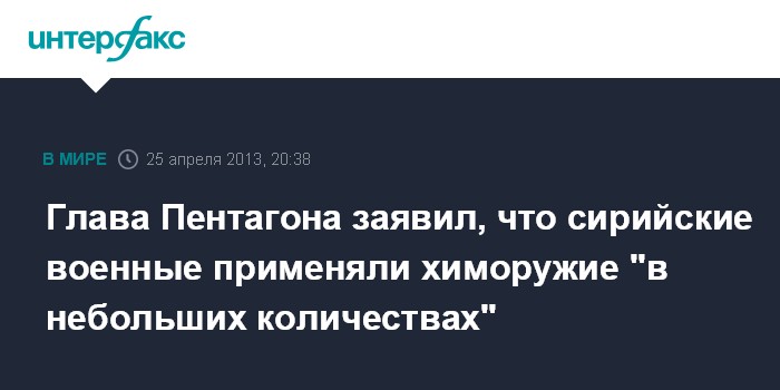 Вашингтон. 25 апреля. INTERFAX.RU - Американская разведка полагает, что сирийская армия применяла в небольших количествах химическое оружие, заявил в четверг глава Пентагона Чак Хейгел.