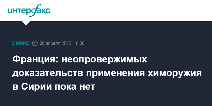 Париж. 26 апреля. INTERFAX.RU - У международного сообщества пока нет неопровержимых доказательств применения химического оружия в ходе конфликта в Сирии, заявили в пятницу в МИД Франции.