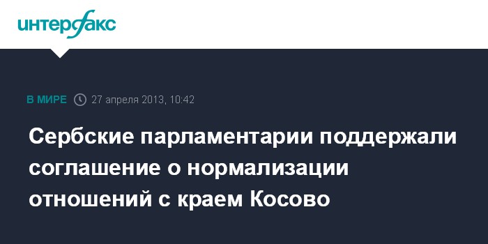 Белград. 27 апреля. INTERFAX.RU - Депутаты сербской скупщины (парламента) в ночь на субботу одобрили соглашение о нормализации отношений между Сербией и сербским автономным краем Косово, сообщает сербская телерадиокомпания РТС. "За" проголосовали 179 депутатов, "против" выступили 24 депутата. Один депутат воздержался, а пятеро не голосовали.