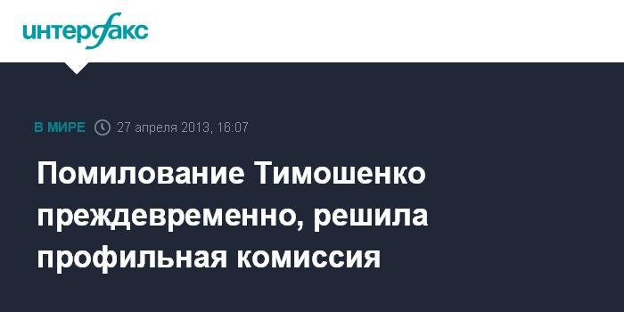 Как сообщает официальный сайт президента, соответствующее решение комиссия приняла на заседании в субботу. "Во время рассмотрения вопроса комиссия определилась, что поскольку расследование уголовных дел пол обвинению Ю.Тимошенко в совершении тяжелых и особенно тяжелых преступлений пока не завершено, и судом по делам не приняты соответствующие решения, вопрос о ее помиловании является преждевременным", - говорится в сообщении.