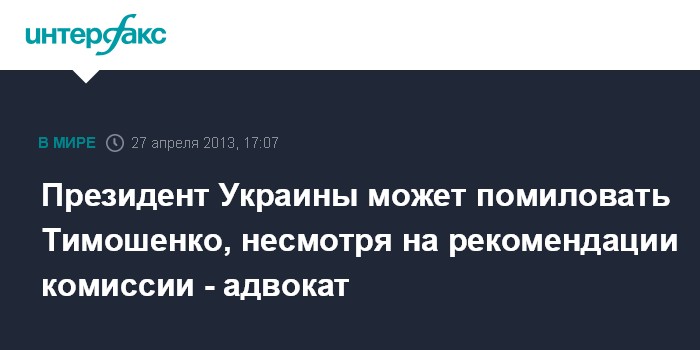 "Решение комиссии носит рекомендационный характер, и все равно окончательное слово остается за президентом. Несмотря на отклонение комиссии, президент может помиловать Тимошенко", - сказал адвокат агентству "Интерфакс-Украина" в субботу, комментируя решение комиссии.