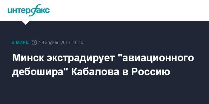Минск. 29 апреля. INTERFAX.RU - Генпрокуратура Беларуси приняла решение экстрадировать в Российскую Федерацию "авиационного дебошира" Сергея Кабалова в соответствии с запросом российских коллег, заявил начальник отдела информации и общественных связей генпрокуратуры Беларуси Петр Киселев журналистам в понедельник в Минске.