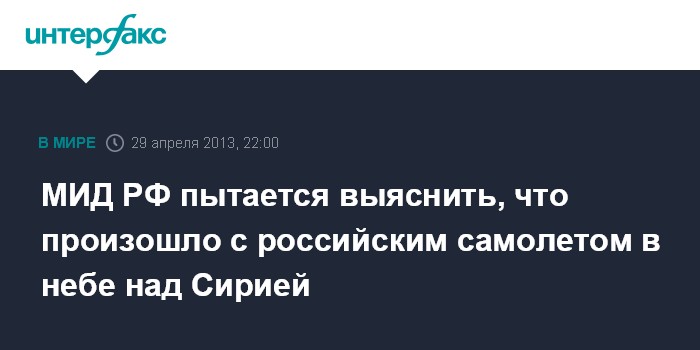 Москва. 29 апреля. INTERFAX.RU - Российское внешнеполитическое ведомство намерено выяснить все обстоятельства в связи с информацией об угрозе, которой, возможно, подвергся российский пассажирский самолет, находившийся в сирийском воздушном пространстве, заявил официальный представитель МИД РФ Александр Лукашевич.
