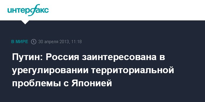 Москва. 30 апреля. INTERFAX.RU - Президент России Владимир Путин заявил, что Россия желает решения проблемы так называемых "северных территорий" на взаимоприемлемых с Японией условиях.