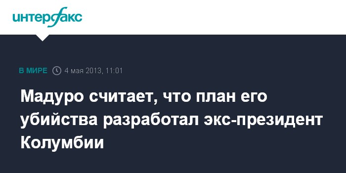 Каракас. 4 мая. INTERFAX.RU - Лидер Венесуэлы Николас Мадуро обвинил бывшего президента Колумбии Альваро Урибе в соучастии в заговоре с целью его убийства, сообщило венесуэльское телевидение. "А.Урибе разработал план с целью убить меня. Он убийца. У меня уже есть достаточно доказательств того, что он участвует в заговоре, среди правых сил в Венесуэле есть лица, которые контактируют с ним для осуществления этого плана", - отметил он в эфире телевидения.