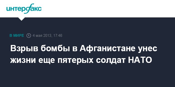 Брюссель. 4 мая. INTERFAX.RU - Пять военнослужащих Североатлантического альянса были убиты в результате взрыва бомбы на юге Афганистана, говорится в заявлении НАТО, опубликованном в субботу. "Взрыв самодельного взрывного устройства унес жизни пятерых солдат на юге Афганистана", - отмечается в заявлении.