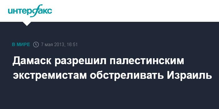 Бейрут. 7 мая. INTERFAX.RU - Режим сирийского президента Башара Асада разрешил базирующейся в Дамаске экстремистской группировке Народный фронт освобождения Палестины - Главное командование осуществлять ракетные обстрелы израильской территории, сообщает во вторник Associated Press.