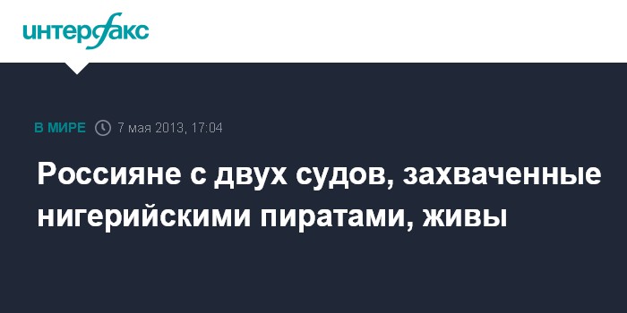 Лагос. 7 мая. INTERFAX.RU - Два россиянина - члены экипажей контейнеровозов "Ганза Марбург" и "Сити оф Сямынь", подвергшихся пиратским нападениям в Гвинейском заливе, живы, сообщили "Интерфаксу" в посольстве России в Нигерии.