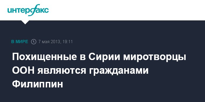 Нью-Йорк (ООН). 7 мая. INTERFAX.RU - Похищенные в Сирии четыре миротворца Сил ООН по наблюдению за разъединением (СООННР) являются гражданами Филиппин, сообщила во вторник журналистам представитель департамента миротворческих организаций ООН Жозефина Герреро.