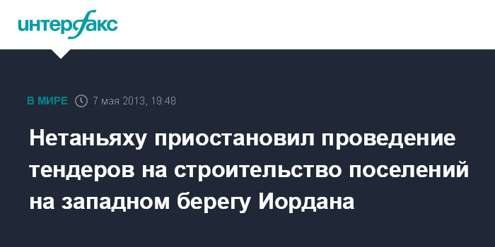 Иерусалим. 7 мая. INTERFAX.RU - Глава правительства Израиля Биньямин Нетаньяху распорядился заморозить процесс проведения тендеров на строительство новых поселений на западном берегу реки Иордан, сообщает во вторник израильское армейское радио.