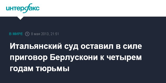 В октябре 2012 г. миланский суд приговорил Берлускони к четырем годам тюрьмы за причастность к финансовым махинациям в принадлежащей ему компании Mediaset. Однако позднее срок тюремного заключения, с учетом принятого в 2006 году закона об амнистии, был уменьшен до одного года.