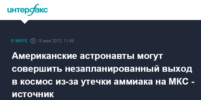 Москва. 10 мая. INTERFAX.RU - Американские астронавты Томас Машберн и Кристофер Кэссиди в субботу, как ожидается, совершат внеплановый выход в открытый космос, чтобы обнаружить место утечки аммиака, сообщил "Интерфаксу-АВН" источник в ракетно-космической отрасли. "Выход запланирован на субботу. Такая оперативность с принятием решения связана с тем, что завтра астронавты еще смогут увидеть место утечки аммиака", - сказал собеседник агентства.