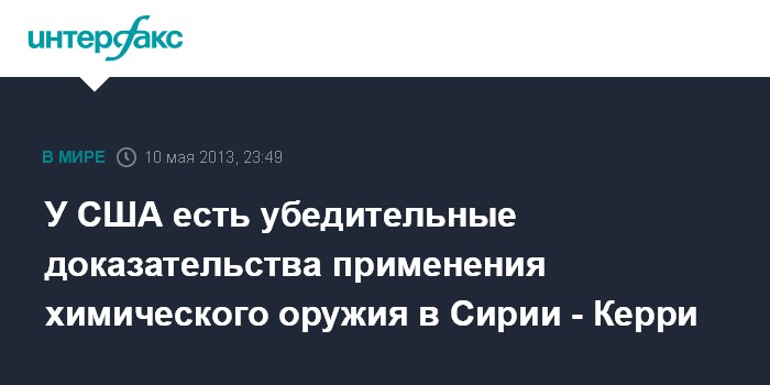 Вашингтон. 10 мая. ИНТЕРФАКС - Власти США располагают вескими доказательствами применения газа правящим режимом сирийского президента Башара Асада, сообщил в пятницу госсекретарь США Джон Керри на пресс-конференции, транслировавшейся на веб-сайте госдепа.