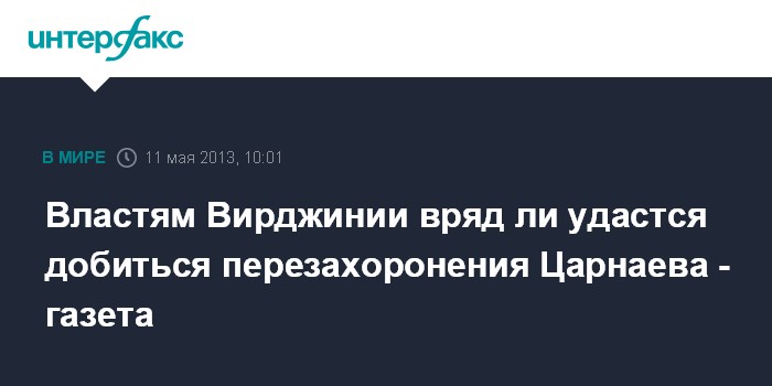Вашингтон. 11 мая. INTERFAX.RU - Власти штата Вирджиния, где похоронен предполагаемый организатор взрывов в Бостоне Тамерлан Царнаев, вряд ли смогут добиться перезахоронения его тела, сообщает в субботу американская газета The Boston Herald. "Традиционно правительство практически не может вмешиваться после выдачи свидетельства о смерти", - приводит газета слова профессора права из университета Уэйк Форест Тани Марш.