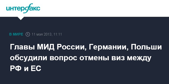 Москва. 11 мая. INTERFAX.RU - Министры иностранных дел России, Германии и Польши обсудили на неформальной встрече в Варшаве вопрос отмены виз для граждан РФ и ЕС, а также энергетическую тематику. "Состоялся заинтересованный обмен мнениями по приоритетным вопросам развития отношений между Россией и ЕС: либерализация визовой практики и продвижение к безвизовому режиму взаимных поездок граждан, подготовка нового безвизового соглашения, тематика энергосотрудничества", - говорится в сообщении, размещенном в субботу на сайте МИД РФ.