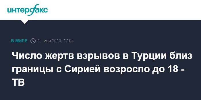 Стамбул. 11 мая. INTERFAX.RU - По последним данным, в результате двух взрывов в турецком городе Рейханлы неподалеку от турецко-сирийской границы погибли 18 человек, еще 22 получили ранения, сообщает в субботу местный телеканал Эн-Ти-Ви. Ранее глава МВД страны Муаммер Гулер в эфире турецкого телевидения сообщил о четырех жертвах взрывов.