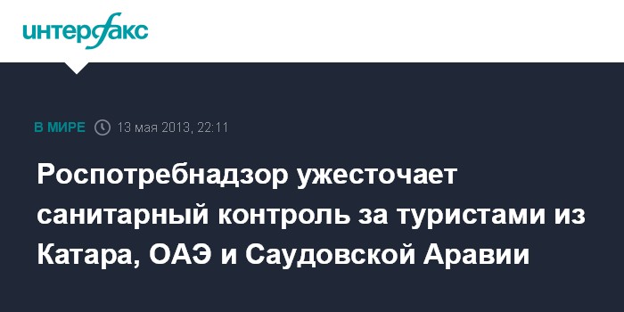 Москва. 13 мая. INTERFAX.RU - Роспотребнадзор усилил санитарно-карантинный контроль в пунктах пропуска через государственную границу РФ в отношении граждан, прибывающих из Саудовской Аравии, Катара и ОАЭ, в связи с осложнением ситуации по заболеваниям, вызванным коронавирусом.