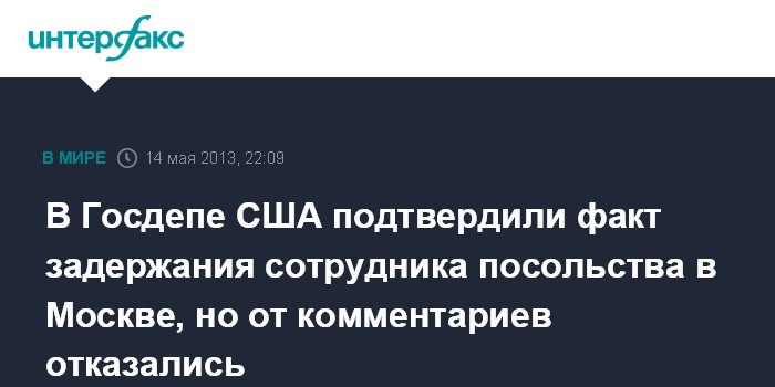 Вашингтон. 14 мая. INTERFAX.RU - Власти США подтверждают факт задержания сотрудника посольства США в Москве, заявил во вторник официальный представитель госдепартамента США Патрик Вентрелл. "Мы можем подтвердить, что сотрудник посольства США в Москве был задержан на короткий срок и затем отпущен, мы видели заявление российского МИД, и у пока нас нет комментариев", - сказал Вентрелл в ходе брифинга.
