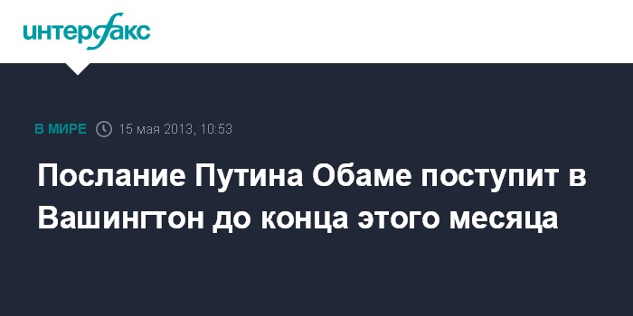 Москва. 15 мая. INTERFAX.RU - Ответное послание Владимира Путина будет передано президенту США Бараку Обаме до конца мая, сообщил пресс-секретарь российского президента Дмитрий Песков.