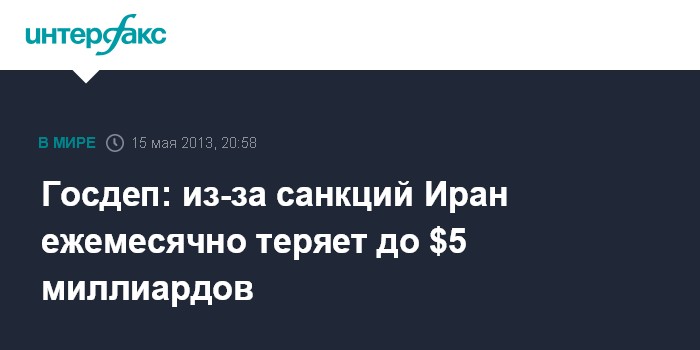 Вашингтон. 15 мая. INTERFAX.RU - Международные санкции против Ирана эффективно ослабляют экономику Исламской республики и ежемесячно лишают ее от $3 млрд до $5 млрд, говорится в опубликованном в среду заявлении замгоссекретаря США Венди Шерман.