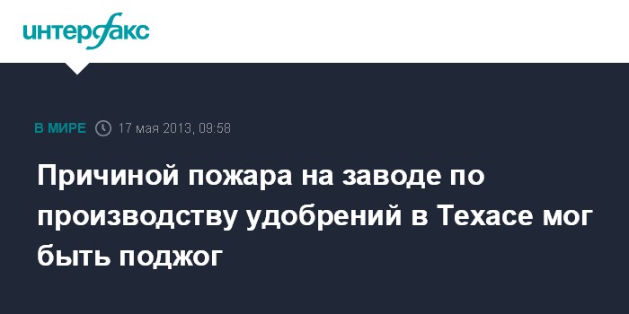 Вашингтон. 17 мая. INTERFAX.RU - Пожар и спровоцированный им взрыв на заводе по производству удобрений в американском городе Уэст (штат Техас) могли произойти по причине действий злоумышленников, организовавших поджог, сообщили в министерстве юстиции США.