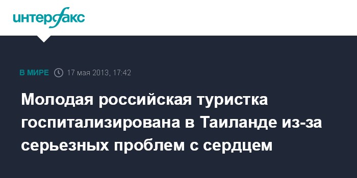 Москва. 17 мая. INTERFAX.RU - 24-летняя туристка из России попала в больницу Бангкока (Таиланд) в состоянии острого кардиогенного шока, сообщает вьетнамский новостной сайт Vietnamnet.