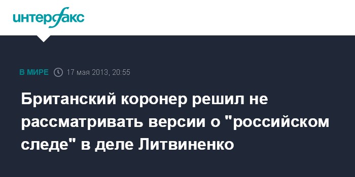 Москва. 17 мая. INTERFAX.RU - Коронер, возглавляющий расследование обстоятельств гибели бывшего сотрудника российских спецслужб Александра Литвиненко в Великобритании, заявил, что не будет принимать на рассмотрение никаких доказательств того, что к его смерти может быть причастно российское государство.