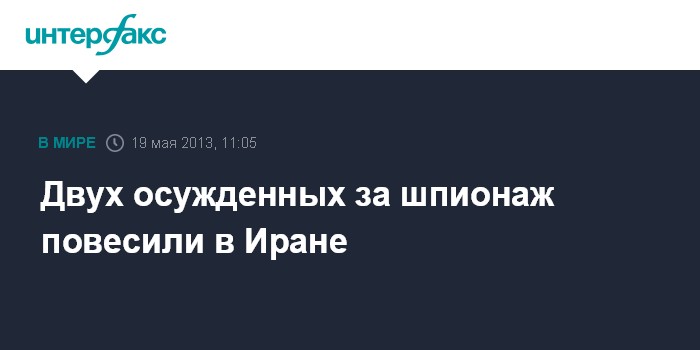 Москва. 19 мая. INTERFAX.RU - В Иране приведена в исполнение смертная казнь через повешение в отношении двух мужчин, приговоренных по обвинению в шпионаже, сообщает в воскресенье британская телерадиокорпорация BBC. По мнению прокуратуры Тегерана, один из казненных - Мохаммад Хейдари - работал на израильскую разведку "Моссад", а второй - Коруш Ахмади - сотрудничал с американским ЦРУ.