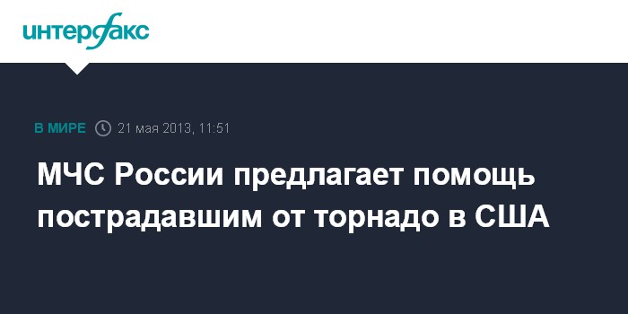 Москва. 21 мая. INTERFAX.RU - МЧС России предложило помощь американским коллегам в ликвидации последствий торнадо, которое обрушилось на штат Оклахома, сообщил глава МЧС России Владимир Пучков.