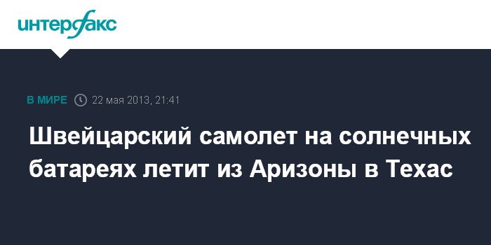 Вашингтон. 22 мая. INTERFAX.RU - Швейцарский экспериментальный самолет компании Solar Impulse, использующий только солнечную энергию, совершает в среду второй этап перелета от западного побережья США к восточному.