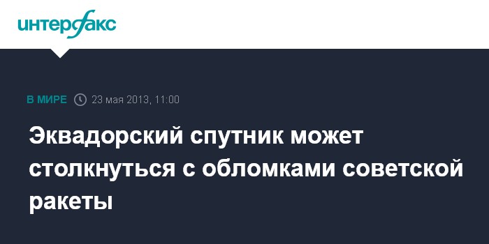 Лондон. 23 мая. INTERFAX.RU - Первый эквадорский наноспутник "Пегас" может в ближайшее время столкнуться с несгоревшими обломками советской ракеты, сообщила в четверг BBC со ссылкой на заявление главы Гражданского космического агентства Эквадора Ронни Надера.