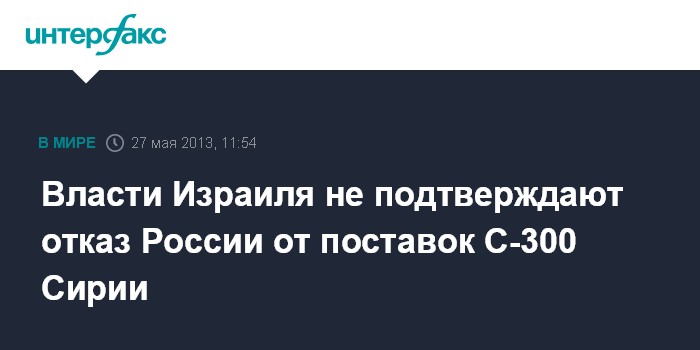 Иерусалим. 27 мая. INTERFAX.RU - В правительстве Израиля опровергли появившиеся в западных СМИ сообщения о том, что Москва якобы отказалась поставлять Дамаску зенитно-ракетные комплексы С-300. "Эти сообщения не соответствуют действительности", - сообщил израильский официальный представитель, которого цитирует газета The Times of Israel.