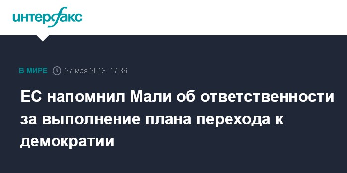 Брюссель. 27 мая. INTERFAX.RU - Европейский союз подчеркивает, что Мали несет полную ответственность за реализацию плана переходного периода, говорится в постановлении Совета ЕС по иностранным делам, принятом в понедельник в Брюсселе.