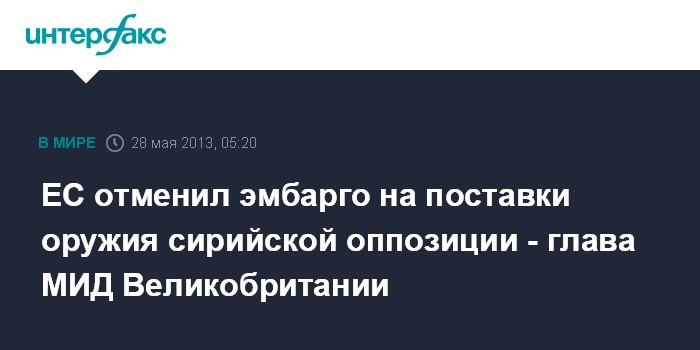 Париж. 28 мая. ИНТЕРФАКС - Евросоюз согласился отменить эмбарго на поставки оружия вооруженным группировкам сирийской оппозиции, заявил министр иностранных дел Великобритании Уильям Хейг.