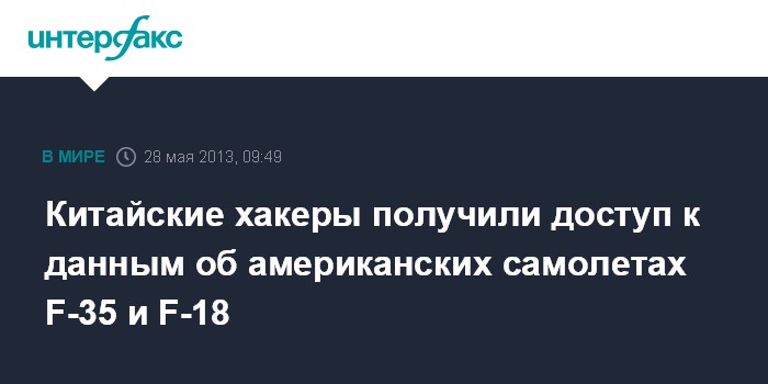 Вашингтон. 28 мая. INTERFAX.RU - Хакеры из КНР за последние годы получили секретные данные о новейшем американском истребителе F-35, а также - об истребителе F-18, пишет во вторник газета The Washington Post со ссылкой на подготовленный для Пентагона доклад.